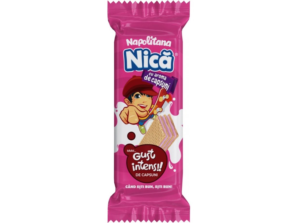 Složení: cukr, bílá pšeničná mouka, rostlinný tuk (palmový), kukuřičný škrob, sušená syrovátka, emulgátor: sójový lecitin, kypřící látky: uhličitan sodný, uhličitan amonný, jahodové aroma, jodizovaná sůl, jahodový prášek 0,1%, přírodní červené barvivo: koncentrát z červené řepy. Alergeny: lepek, sója, laktóza.