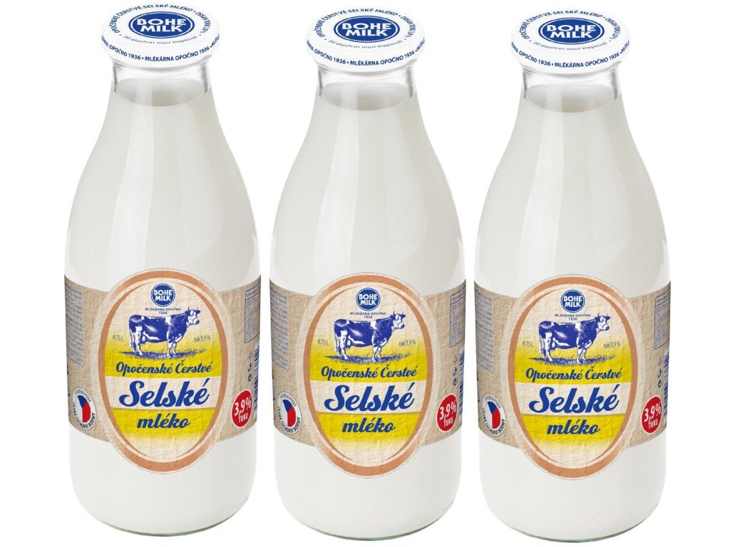 Opočenské selské mléko 3,5 % ve skle 750ml za 9,9 Kč.