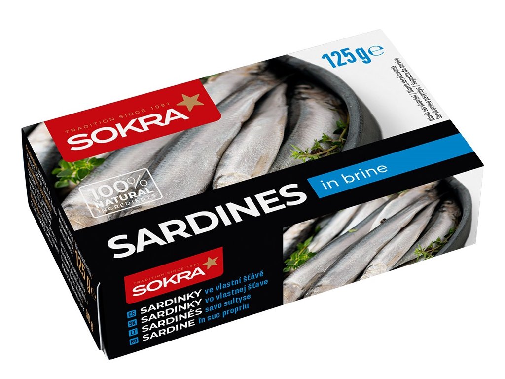 Složení: sardinka obecná (Sardina pilchardus) 72%, pitná voda 27%, jedlá sůl.